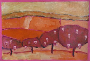 2010Bomen in het bos, monoprint met acrylverf, geabstraheerd.