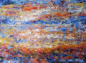 2009Grillige rode vlakken op een veelkleurige ondergrond.