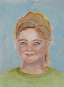 2013Mayte met een oud t-shirt aan, maakt een schilderij voor opa. Dit tafereel heb ik met het paletmes geschilderd.